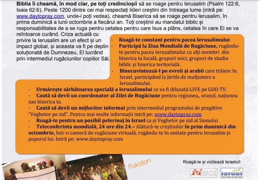 - Teleconferinta mondială, 24 ore din 24.– Alătură-te creștinilor în prim duminică din octombrie, într-o cameră de rugăciune virtuală, rugându-te în unitate pentru Ierusalim și poporul lui. Intră pe: www.daytopray.com