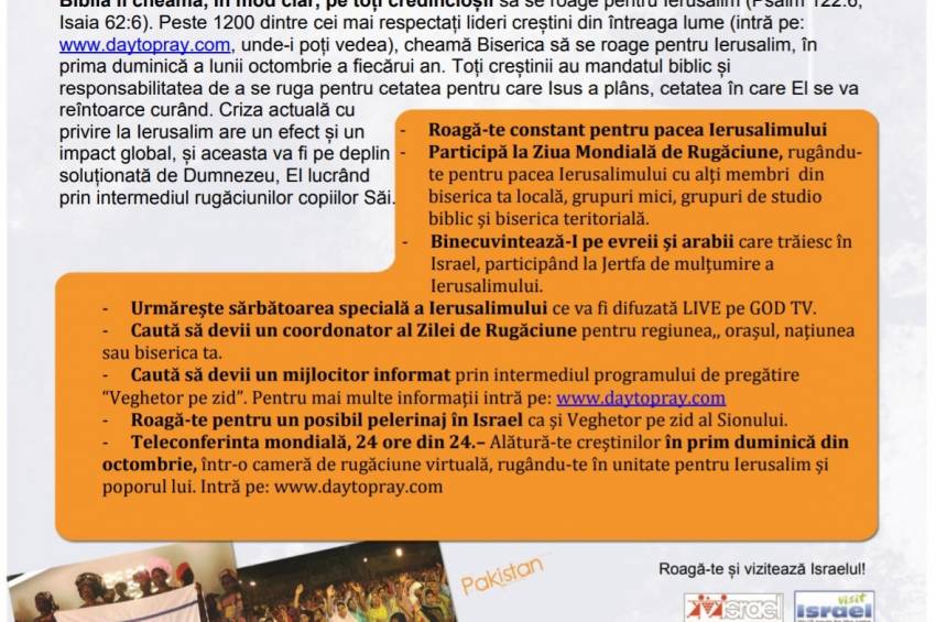 - Participă la Ziua Mondială de Rugăciune, rugându-te pentru pacea Ierusalimului cu alți membri din biserica ta locală, grupuri mici, grupuri de studio biblic și biserica teritorială.