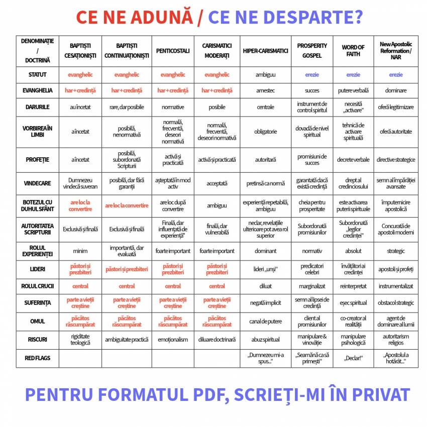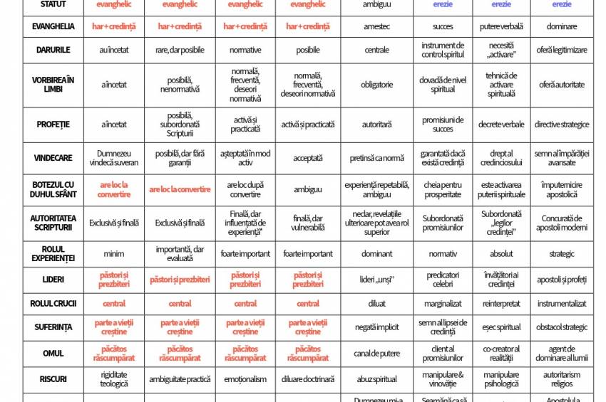 Nu pentru că drumul credinței ar fi nou, ci pentru că limbajul folosit astăzi în jurul lui a devenit confuz. În dezbarile dintre lideri, biserici și mișcări creștine se vorbește mult despre diferențe și asemănări, dar adesea fără repere clare. Tabelul a fost gândit ca o hartă teologică: un instrument concis și sistematizat care arată unde ne aflăm și de ce există tensiune în jurul acestor subiecte. Nu este exhaustiv, nu este complet și nici 100% corect. Unii numiți acolo nu vor fi de acord cu ”pătrățica” în care se regăsesc.